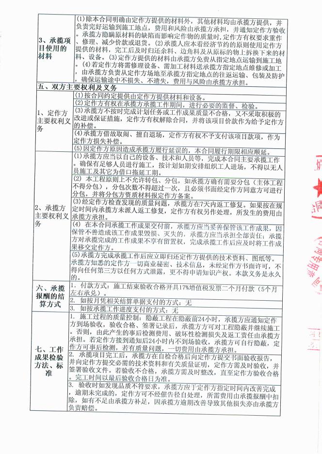 4、乙方不得將工程轉(zhuǎn)包給其他單位,乙方在接收甲供設(shè)備及鋼材需與甲方辦理相關(guān)手續(xù),乙方在施工完畢后將所有余材全部移交甲方,并辦好交接手續(xù),一律不得將余材出售或移做它用;